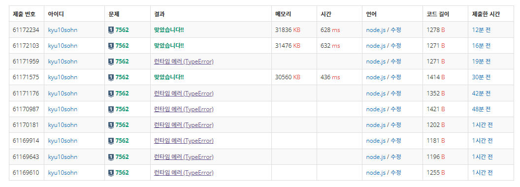 - '체점현황' 탭을 누르고 언어를 node.js로 설정하면 많은 제출에 런타임 에러(TypeError)가 난걸 확인할 수 있다. 나 또한 VS Code에서는 아무 문제 없이 작동하는 코드가 제출만 하면 런타임 에러(TypeError)가 나서 답답했다.